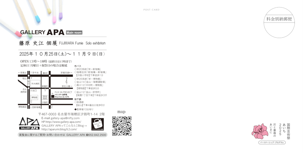 | ■名古屋にて個展の機会を頂きました。地元での久しぶりの機会となります。 サンドペーパーに、昔懐かしい色付きマッチ棒で描いた大作(138×345cm)ほか、サンドペーパーに描いた作品を出品します。 個展 2025年10月25日(土)から11月9日(日) ギャラリーAPA メインルーム ウェブサイト http://www.gallery-apa.com/index.html 住所 〒467-0003名古屋市瑞穂区汐路町1-14 2階 地下鉄 駐車場: 10台あり |